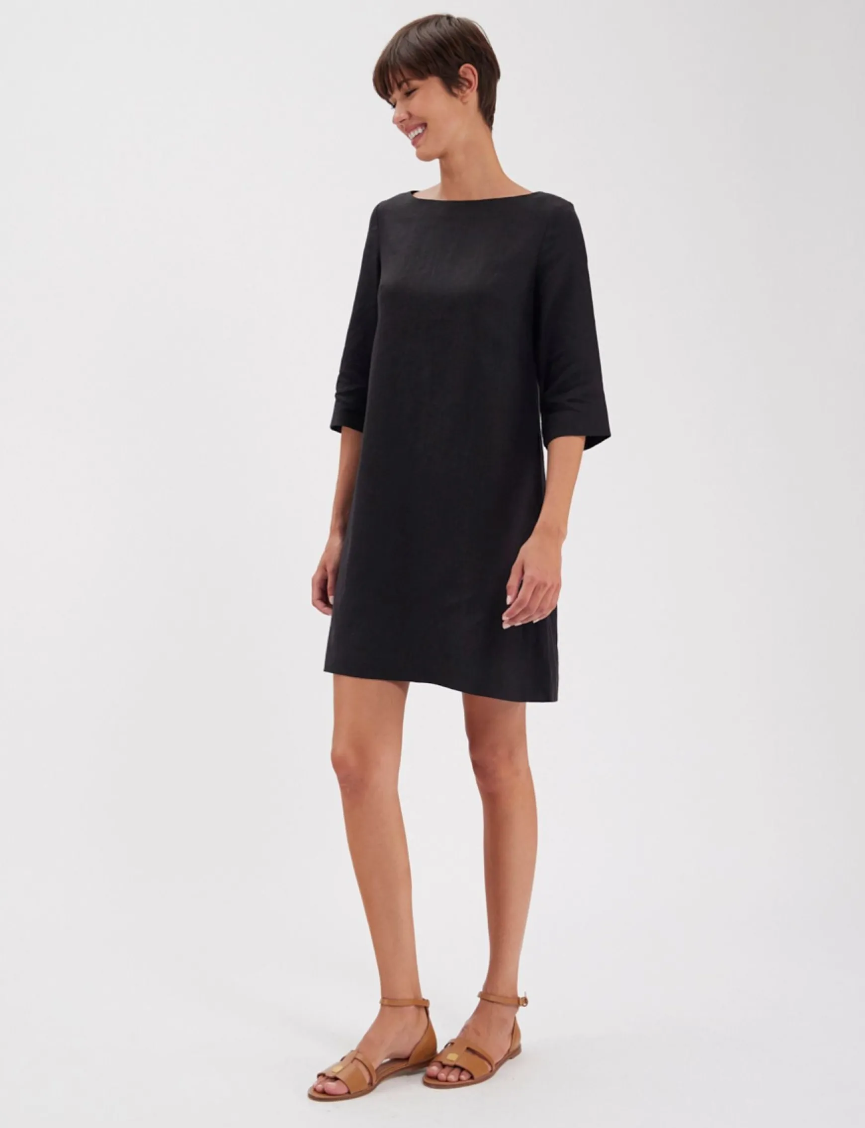 Megan is a very elegant dress that will be at the heart of your wardrobe, day or evening. It comes here in a 100% linen fabric that makes it surprisingly fluid and comfortable, with a very casual-chic elegance. Its trapeze shape is very casual-chic, creating a geometric silhouette that’s perfectly proportioned and harmonious, paying homage to the modernised style of the 60s.