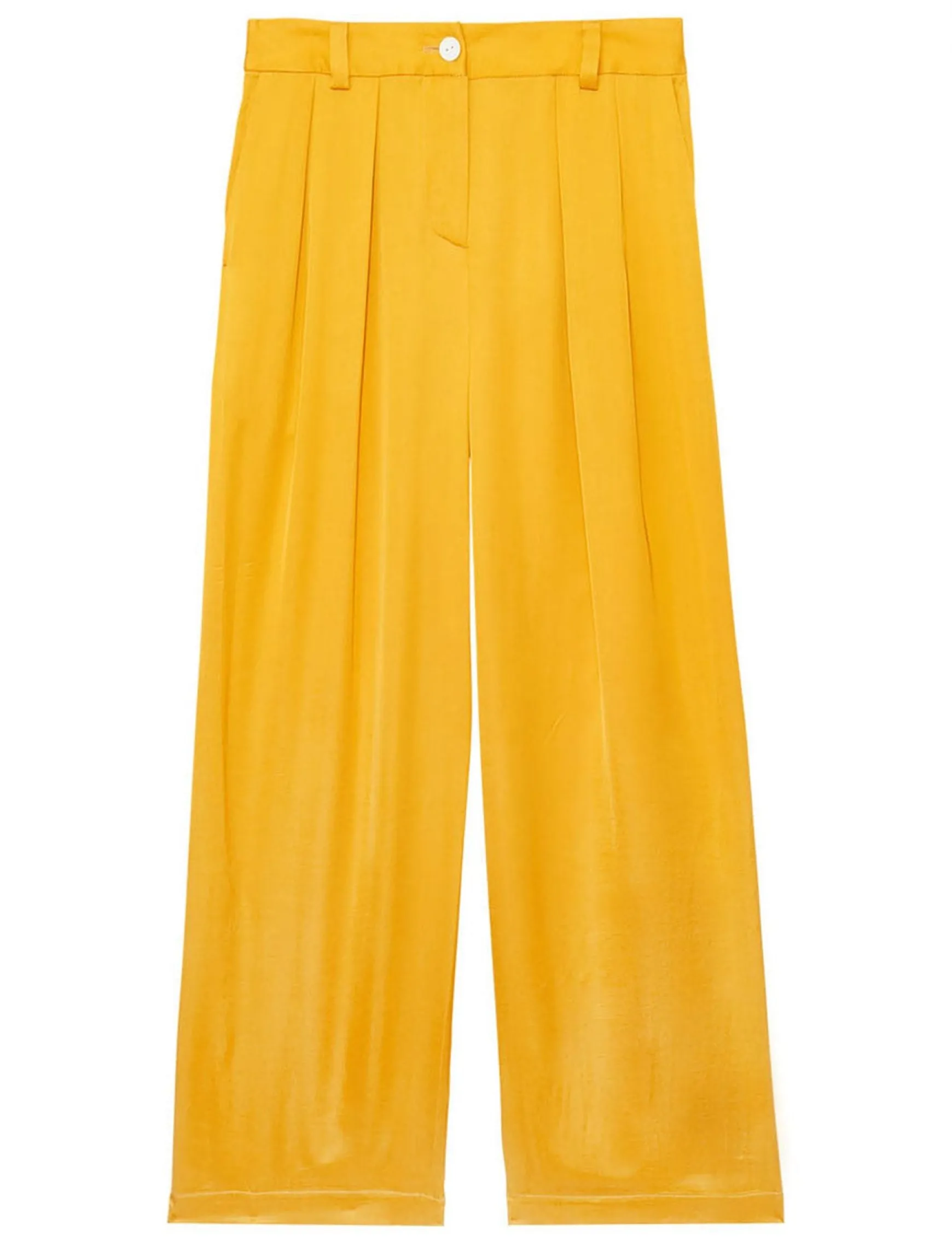 The buttercup yellow Luciano trousers are a magnificent piece, wide and fluid, and very fashionable thanks to their many worked details, such as the pleats on the front and the waistband. They add a touch of controlled elegance and fantasy to your wardrobe.