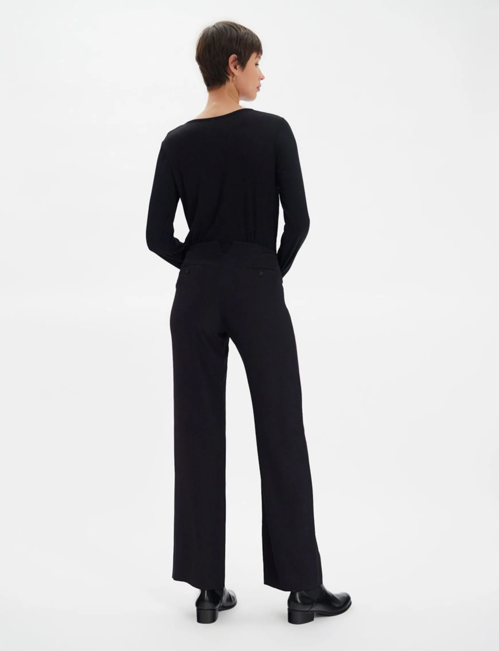 The Gabriel trousers in black viscose are elegant and comfortable. Their high waist, enhanced by a double row of buttons, and straight cut make them a timeless piece.