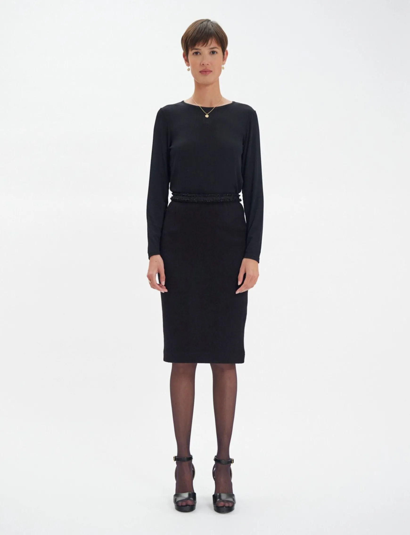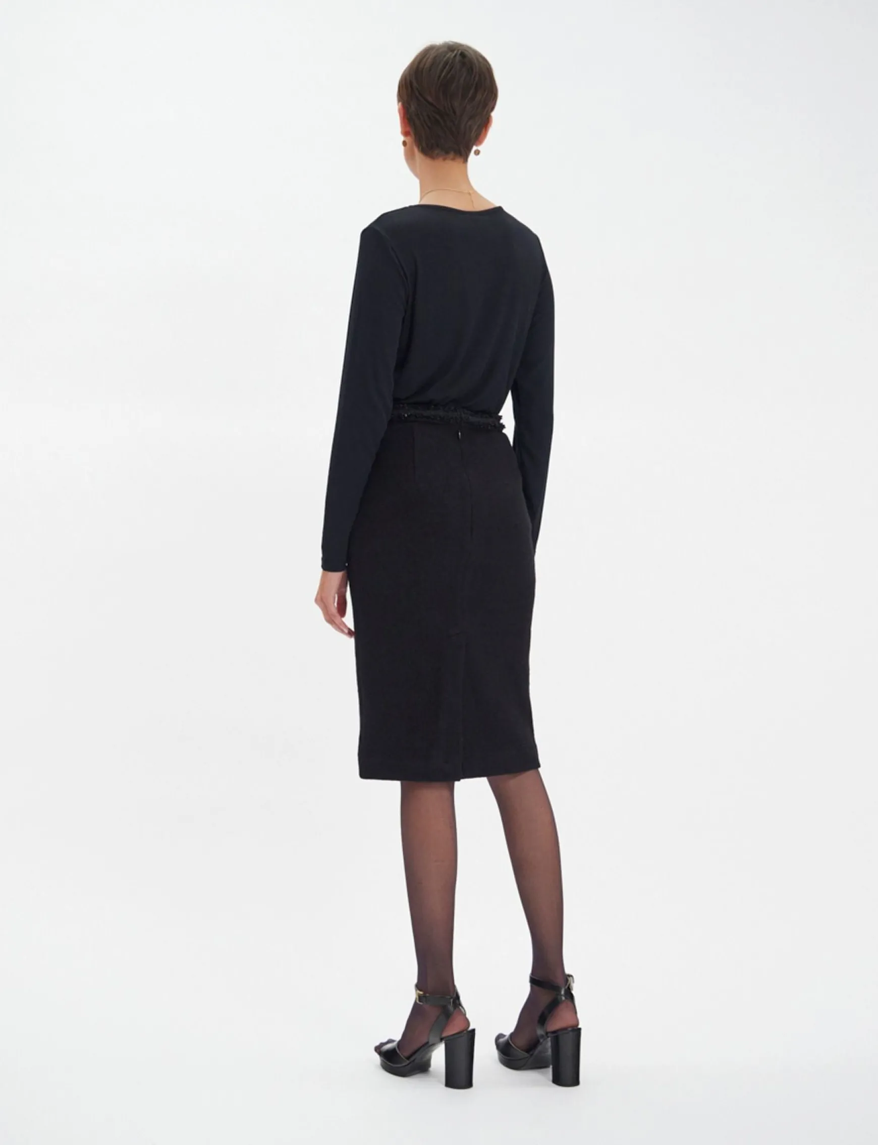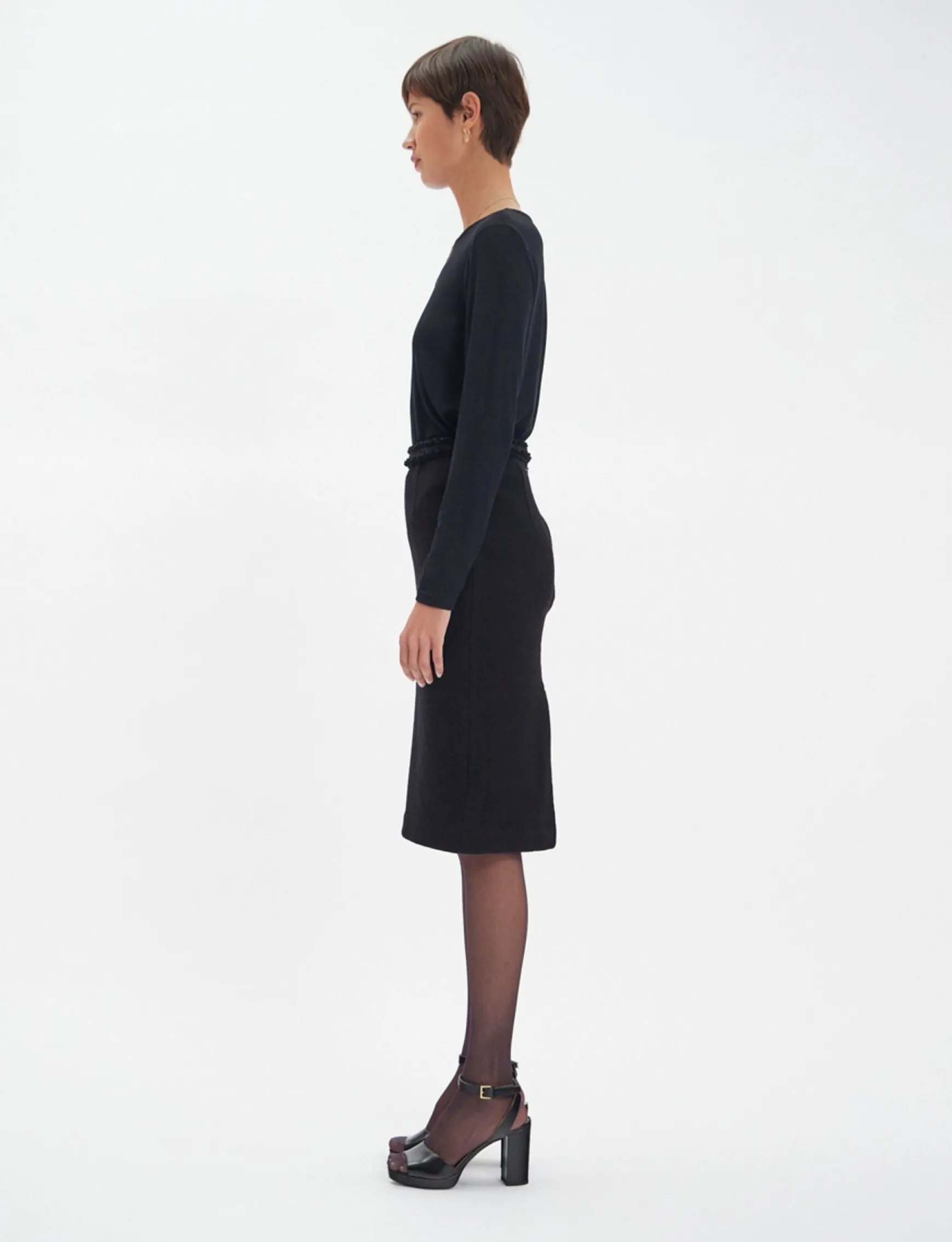 Gabriela is a superb pencil skirt in the chic Ines de la Fressange Paris style, creating a fluid, refined silhouette. It is offered here in a beautiful black wool, giving it comfort and timeless elegance.
