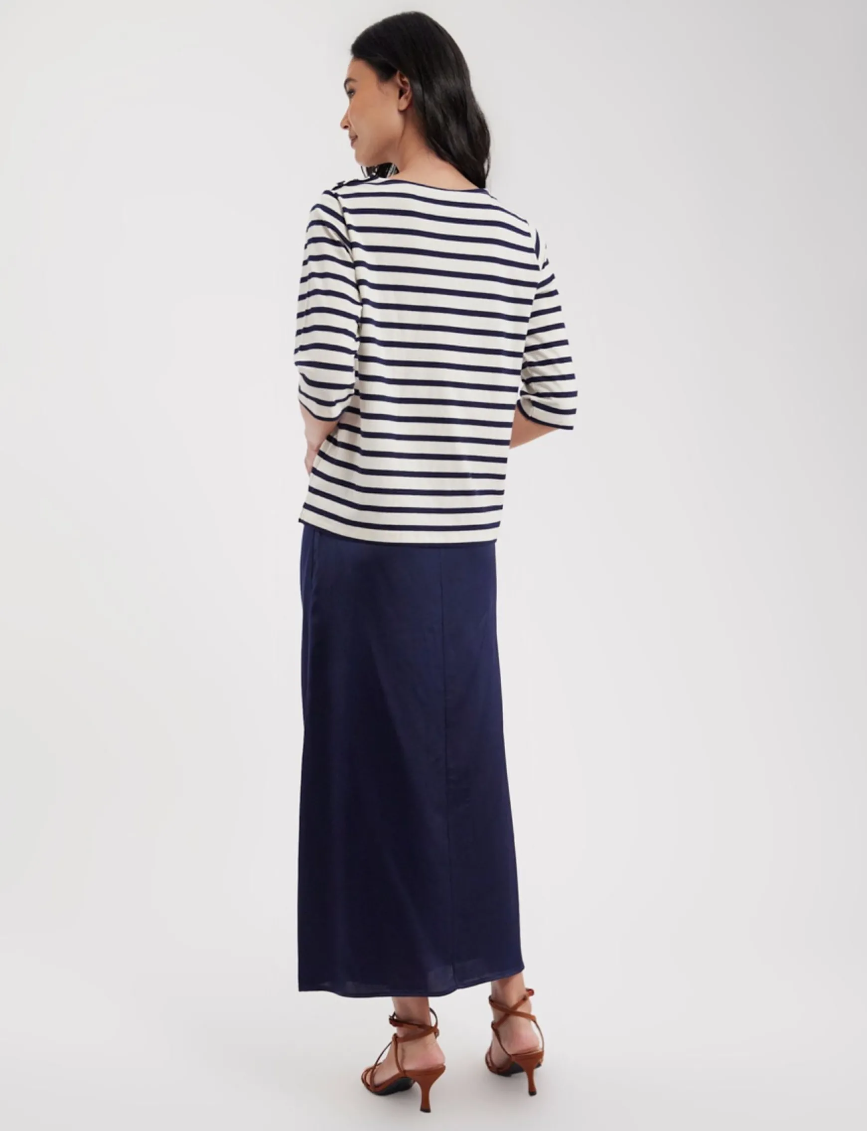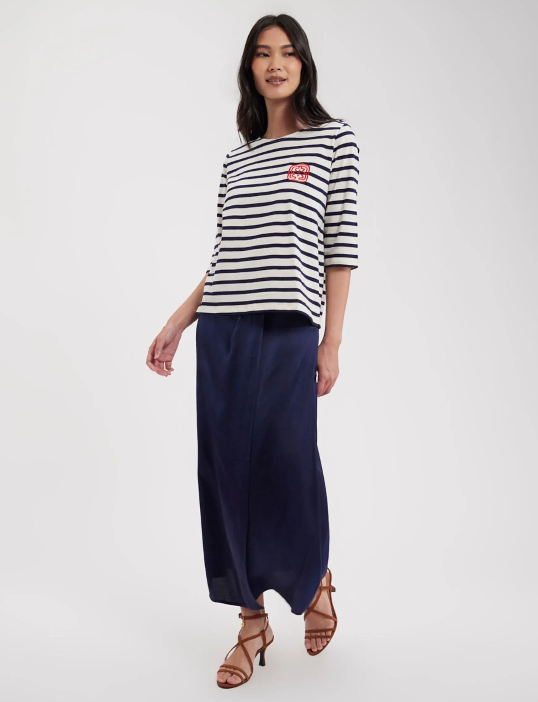 Discover the new seasonal sailor jacket from Ines de la Fressange Paris. It’s back this season in superb cotton, with button shoulder fastenings and navy stripes contrasted by the famous oak leaf logo, the House’s symbol, embroidered on the chest in red. The art of revisiting the French sailor suit in total elegance!