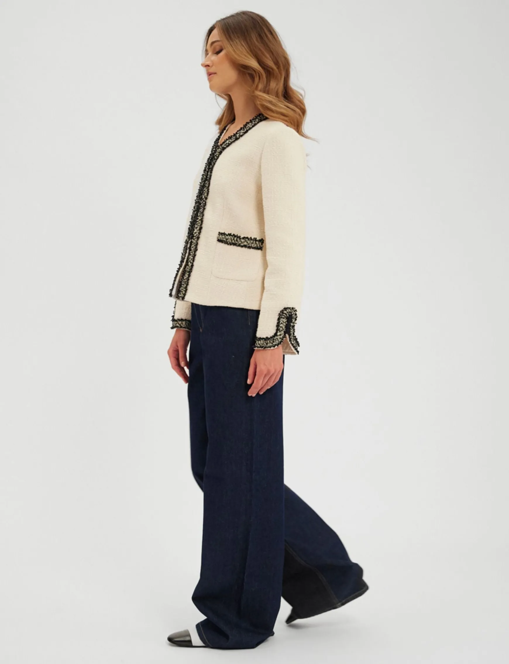 The new Misia jacket is already a classic. Particularly elegant yet extremely comfortable, its straight cut is accentuated by a braid, hand-applied in the traditions of sophisticated craftsmanship, giving it an irresistible allure. Sober yet dressy, it’s perfect for day or evening, dressing up any figure and always looking glamorous. It’s the perfect embodiment of French elegance.
