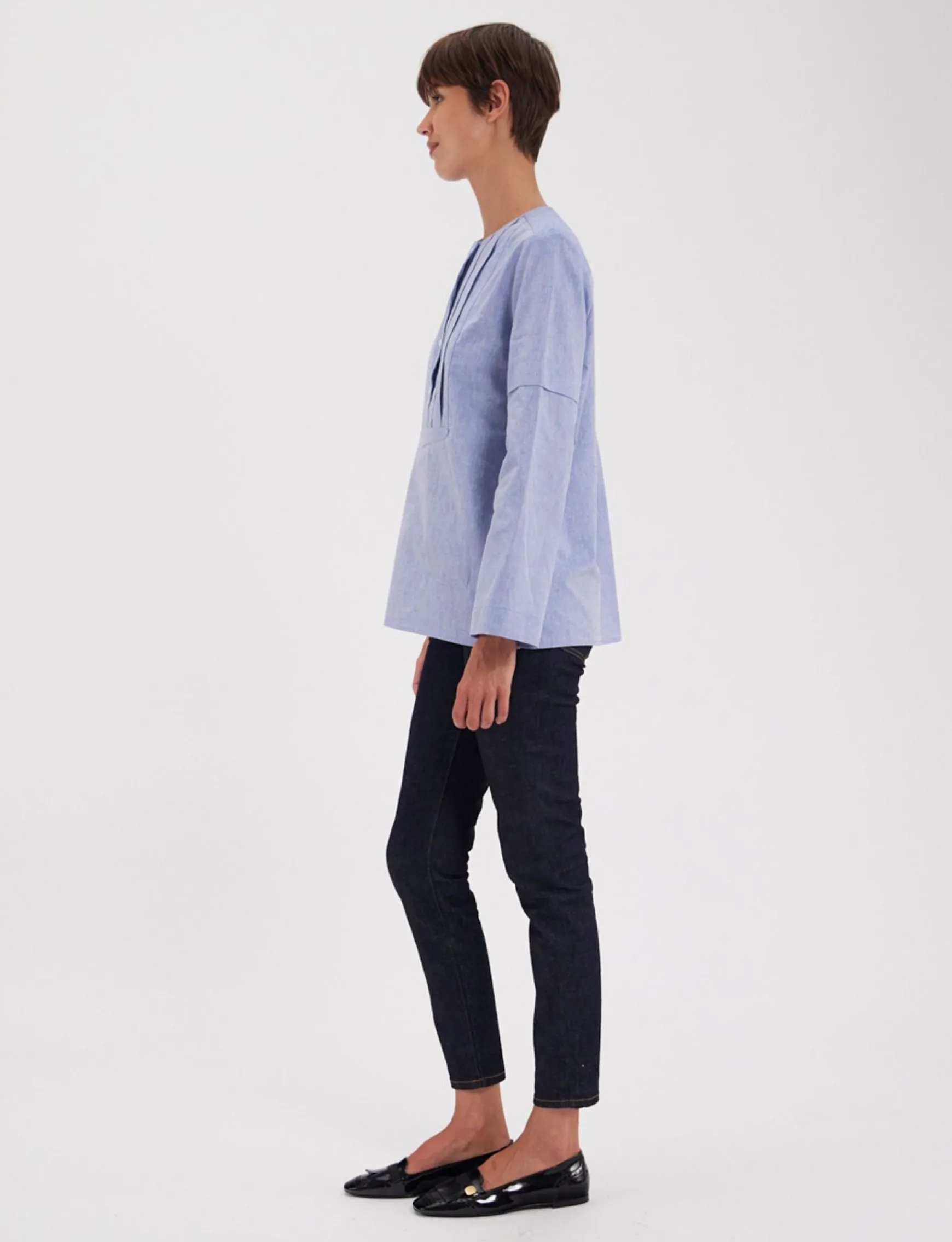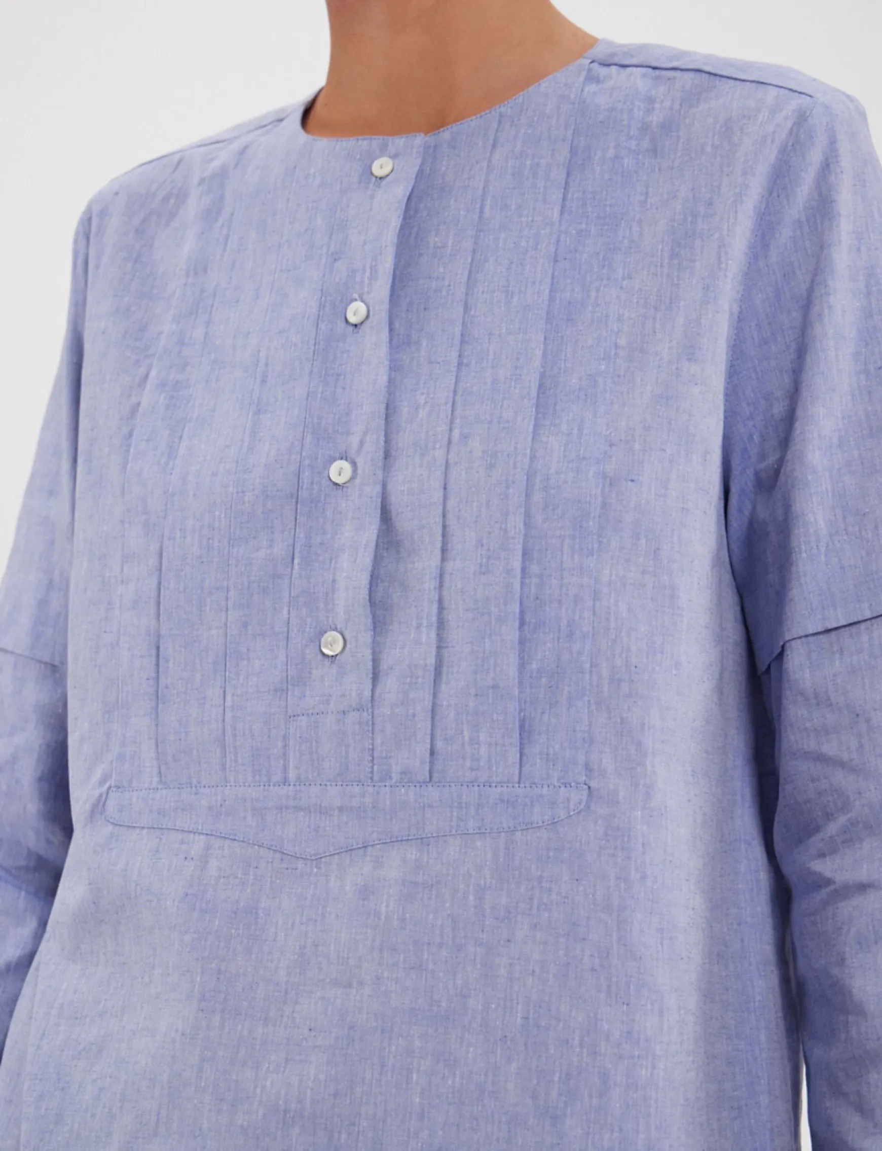 Nanette topWide cutRound necklineLong sleevesPleated detail on sleevesBottom slitsPleated plastron with buttons