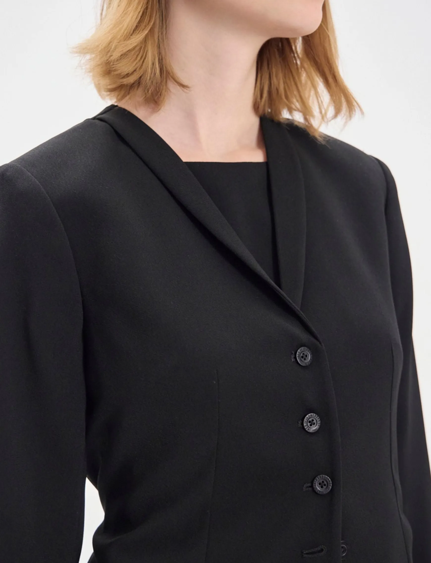 Ole is a superb bolero jacket that will complement many of your outfits. With its short cut, waistcoat-style cut-out, shawl collar and beautiful fabric, different between the back (which you can tie) and the front, it’s highly original, combining elegance with a fashionable edge.