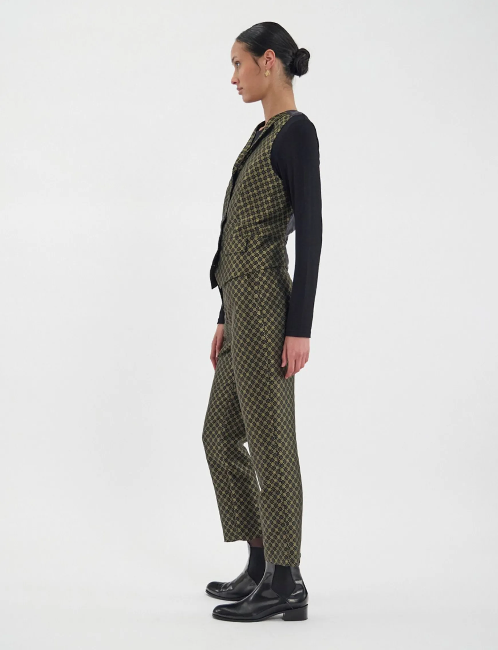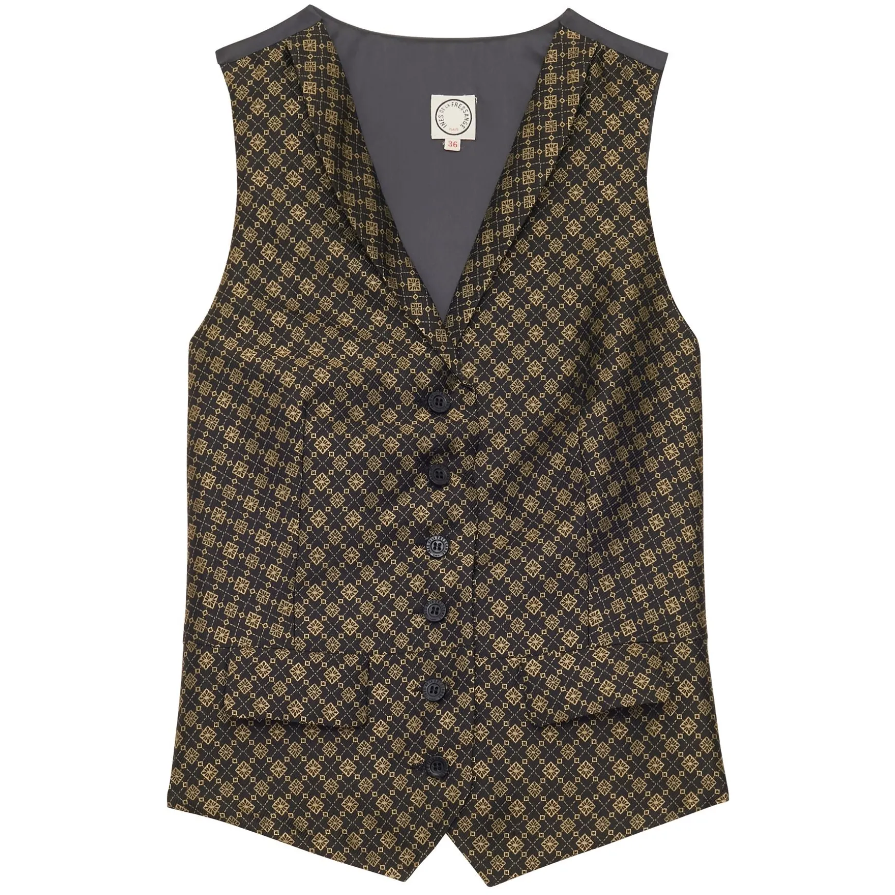 Ines de la Fressange Paris brings you the elegant Robinson waistcoat, a distinguished piece that is back in fashion. This season, the Robinson waistcoat is available in a beautiful black and gold fabric that is extremely refined. It can be worn with a shirt or next to the skin.