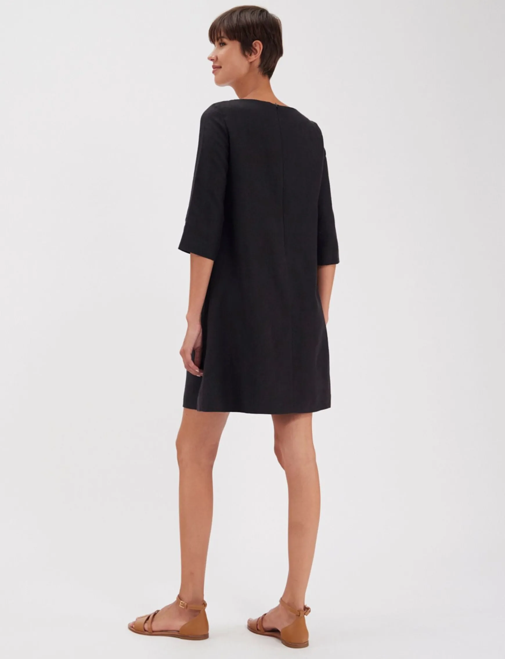 Megan is a very elegant dress that will be at the heart of your wardrobe, day or evening. It comes here in a 100% linen fabric that makes it surprisingly fluid and comfortable, with a very casual-chic elegance. Its trapeze shape is very casual-chic, creating a geometric silhouette that’s perfectly proportioned and harmonious, paying homage to the modernised style of the 60s.