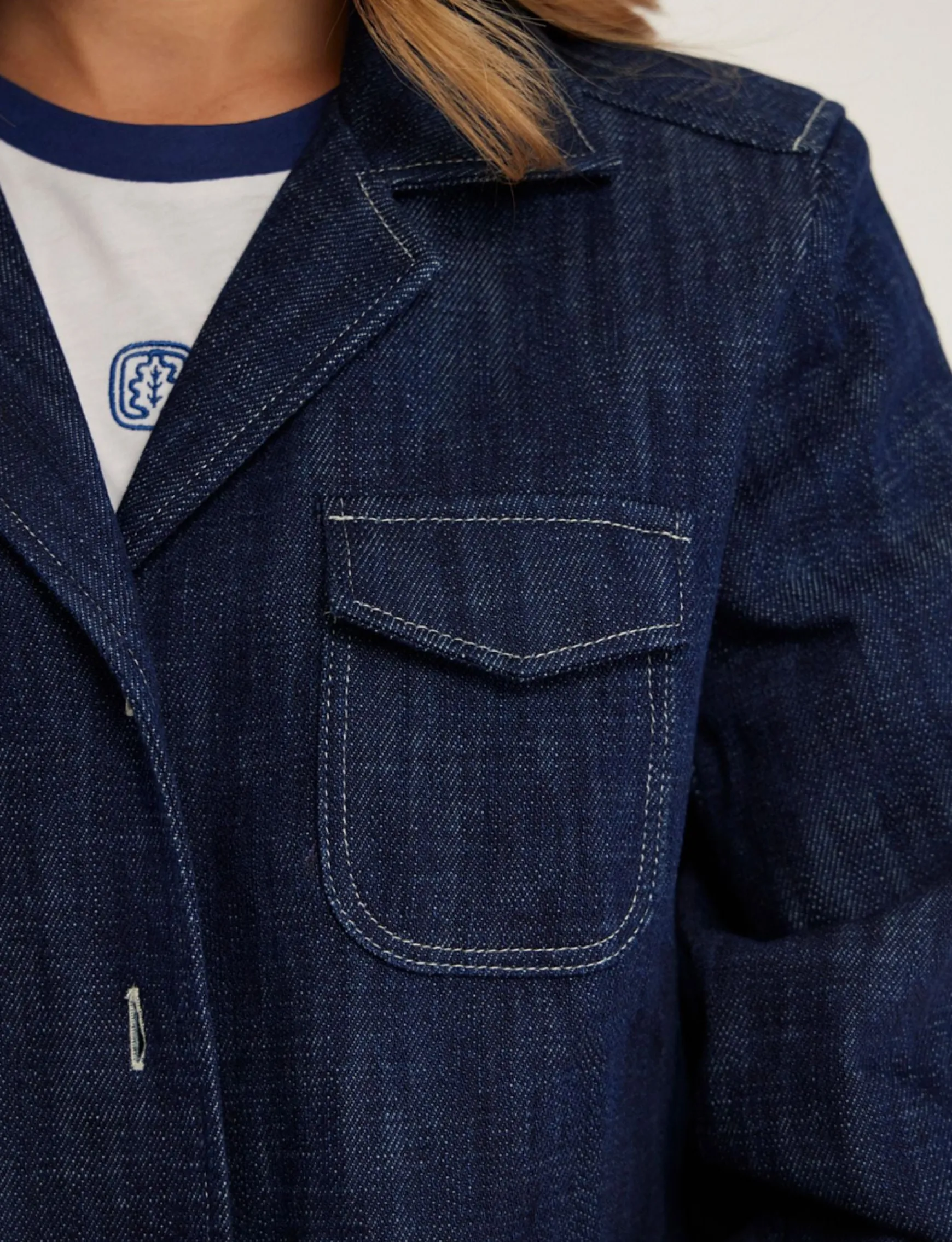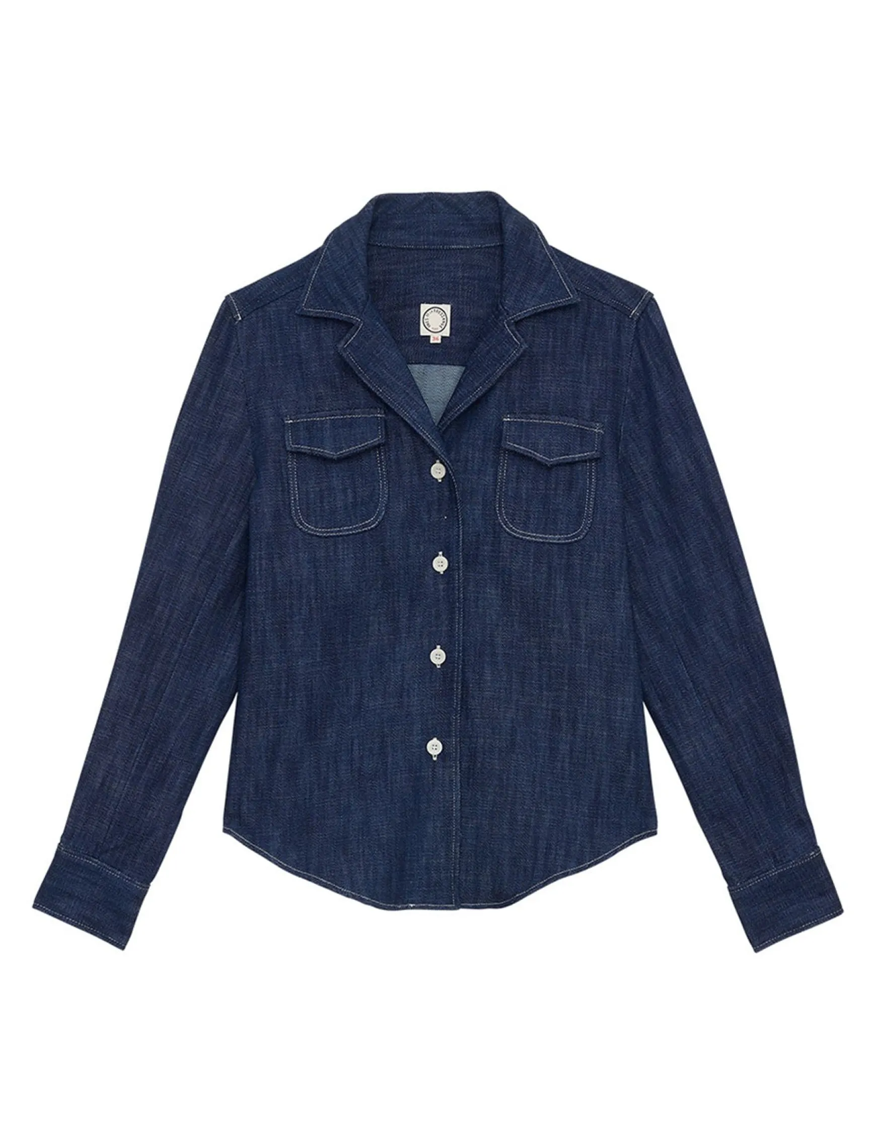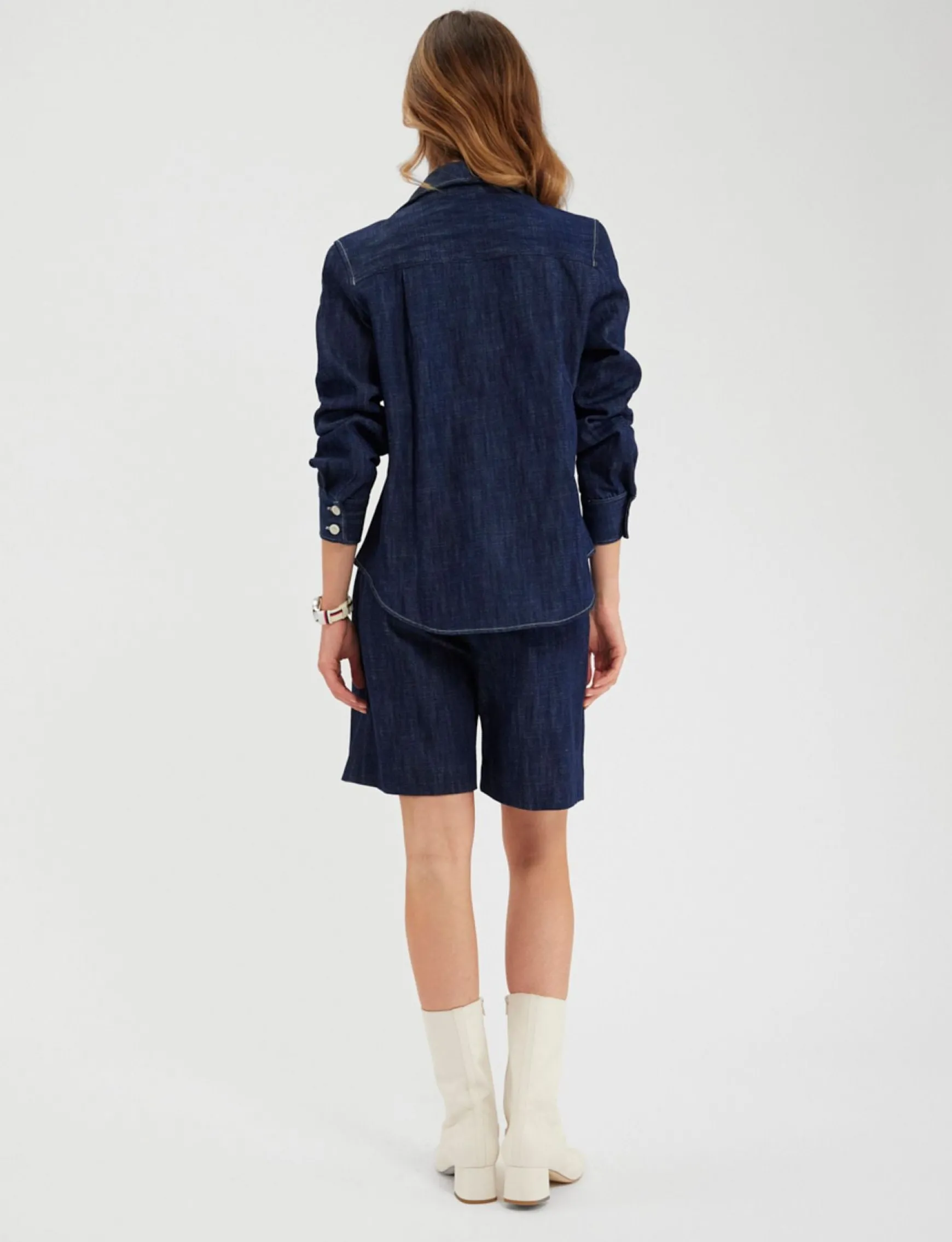 The Evana shirt is a straight-cut shirt in denim cotton, sober and original, that will enhance your wardrobe with a piece inspired by work styles, revisited with finesse. Its cut makes Evana very comfortable to wear, while the two patch pockets on the front add a touch of practicality and authenticity.