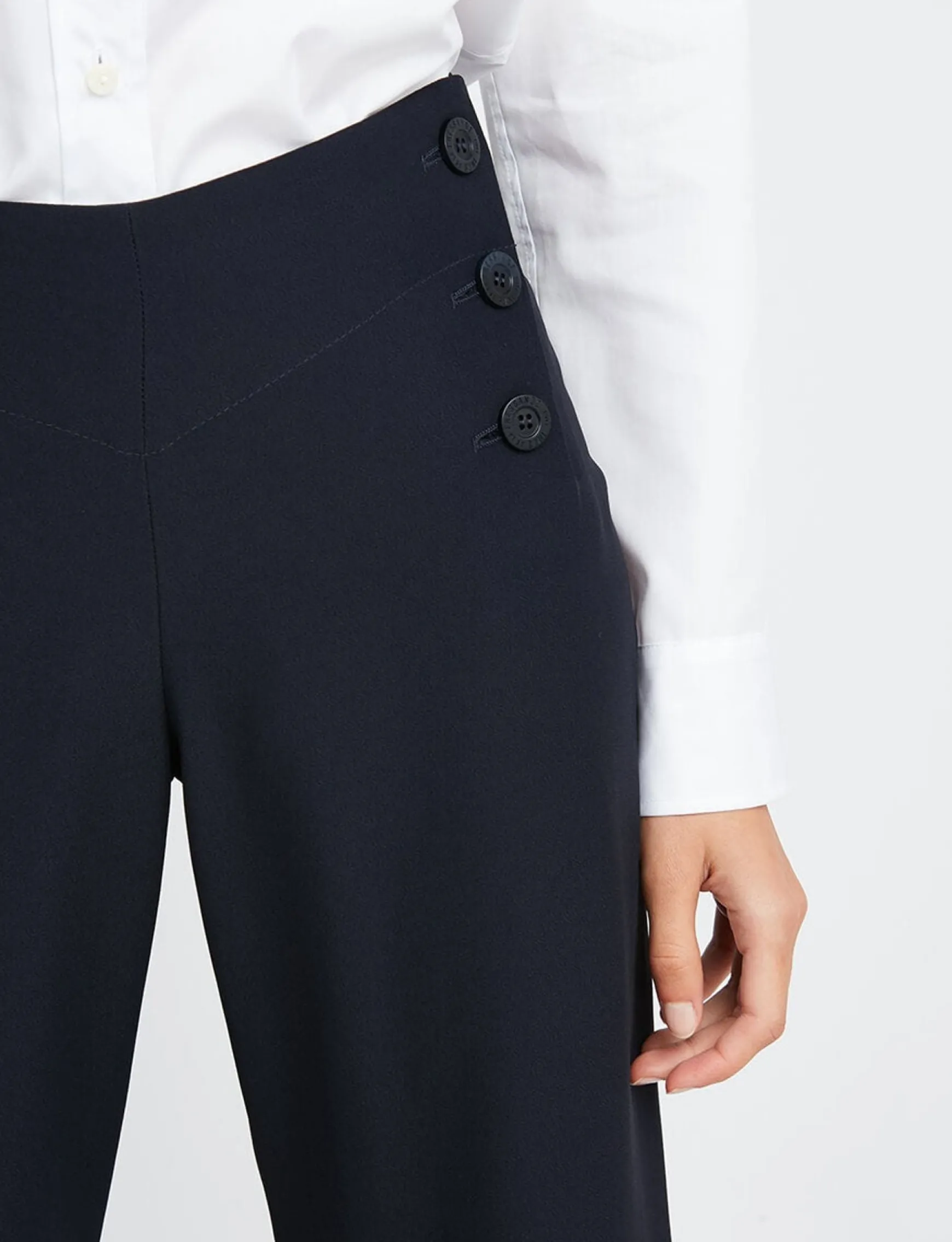 The Gabriel trousers in navy blue viscose are elegant and comfortable. Their high waist, enhanced by a double row of buttons, and straight cut make them a timeless piece.