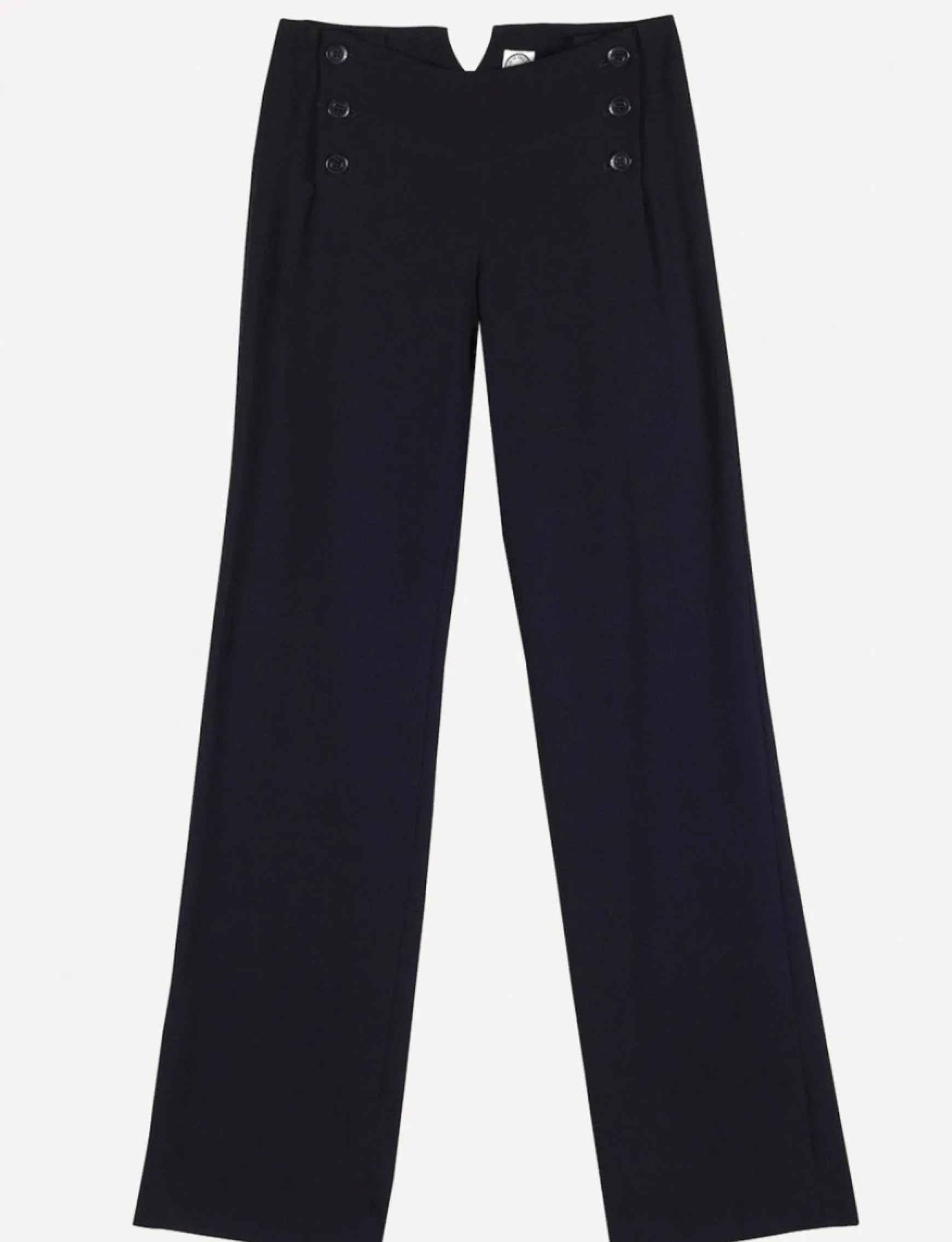 The Gabriel trousers in navy blue viscose are elegant and comfortable. Their high waist, enhanced by a double row of buttons, and straight cut make them a timeless piece.