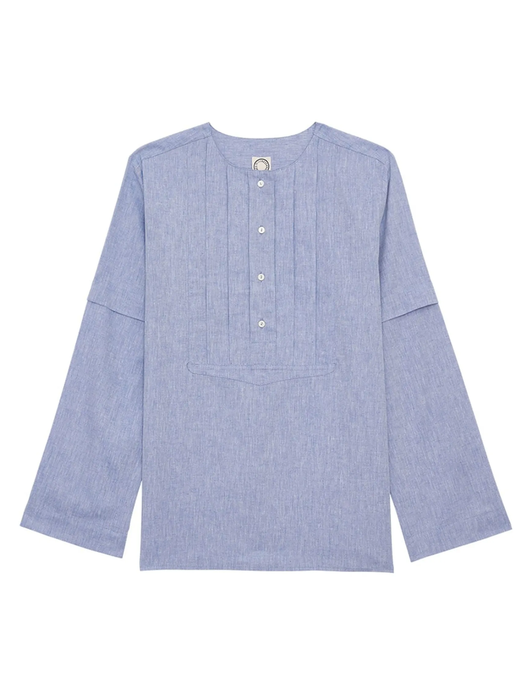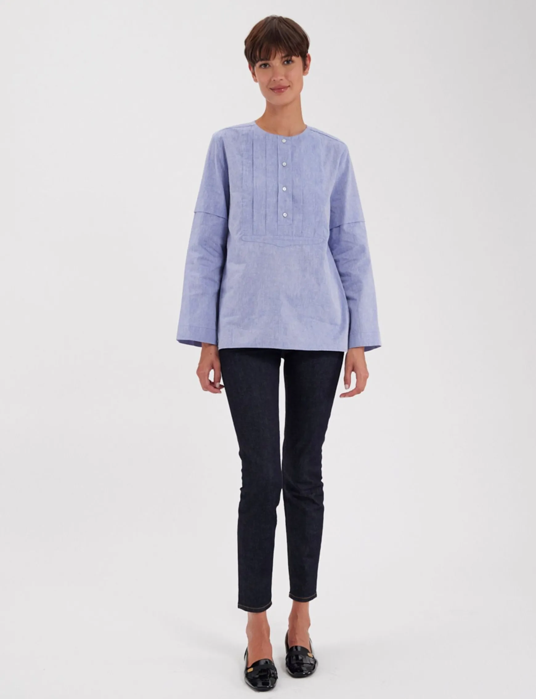 Nanette topWide cutRound necklineLong sleevesPleated detail on sleevesBottom slitsPleated plastron with buttons