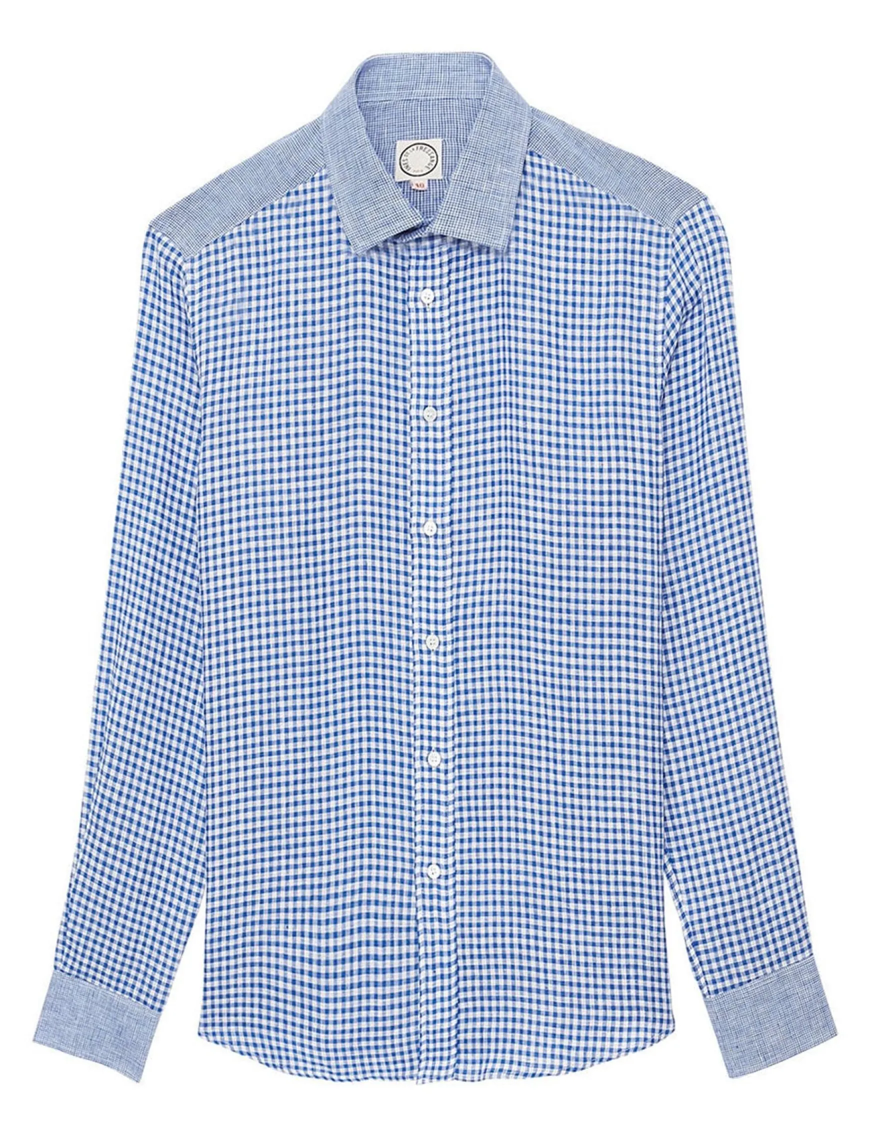 The relaxed elegance of Ines de la Fressange Paris applied to a new shirt for men’s wardrobes, with a very elegant cut, a highly original Vichy pattern complemented by inserts in a different pattern, and the noblest of summer materials, linen… This new shirt combines the pleasure and natural qualities of linen with the originality of relaxed patterns, alternating Vichy check and shoulders, cuffs and collar in a superb raw blue. The cut is straight, slightly fitted, emphasising the silhouette without enclosing it, with a slim Italian collar and fitted sleeves.The shirt has a straight, slightly slim fit that emphasises the silhouette without constricting it, with a slim Italian collar and fitted sleeves. Every detail has been carefully thought out: lined front placket with topstitching, double-breasted cuffs and signature braid Ines de la Fressange Paris, which adds an extra touch of personality. This shirt can be worn casually, over trousers, with the collar open. On its own, or even under a jacket, it’s a sign of informal elegance in any circumstance!