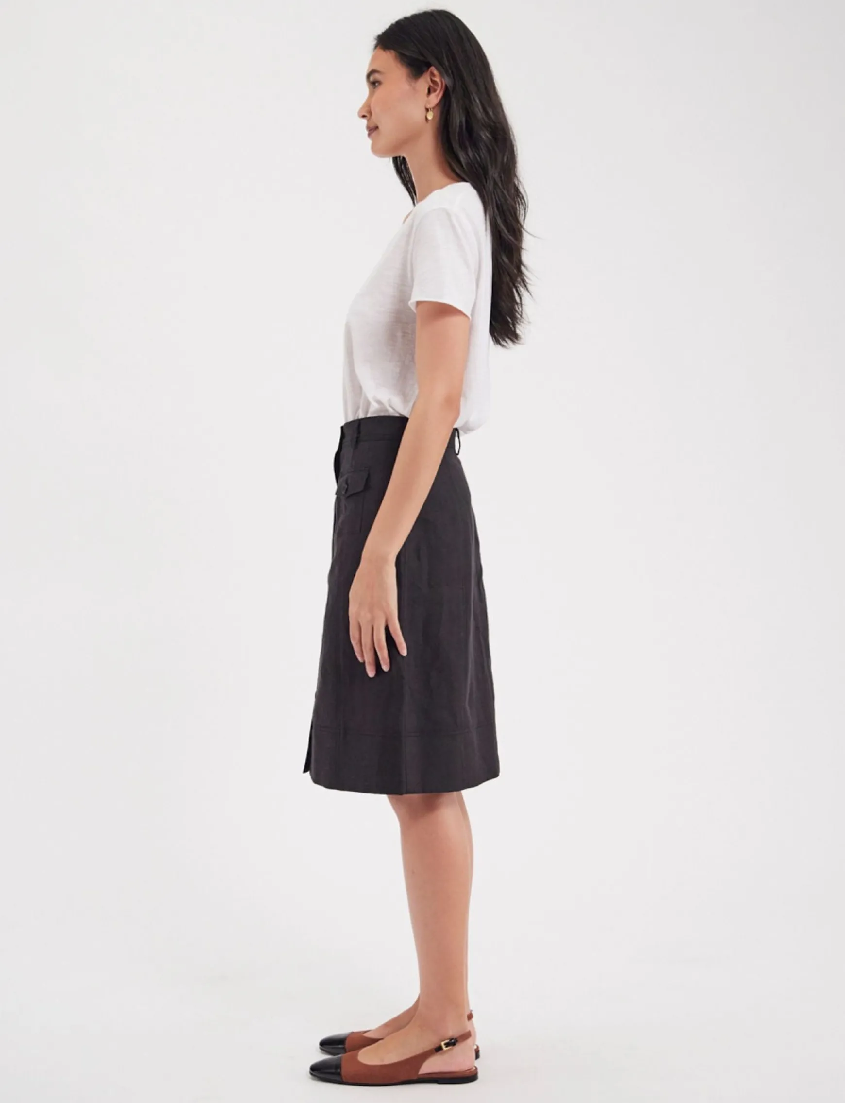 Discover the new Rachel skirt with its elegant trapeze shape. Its stylish details and topstitching combine with the comfort and nobility of linen to make it ideal to wear. This season it comes in linen, the perfect material for the summer season, and its sober, elegant colour makes it perfect for a thousand occasions.