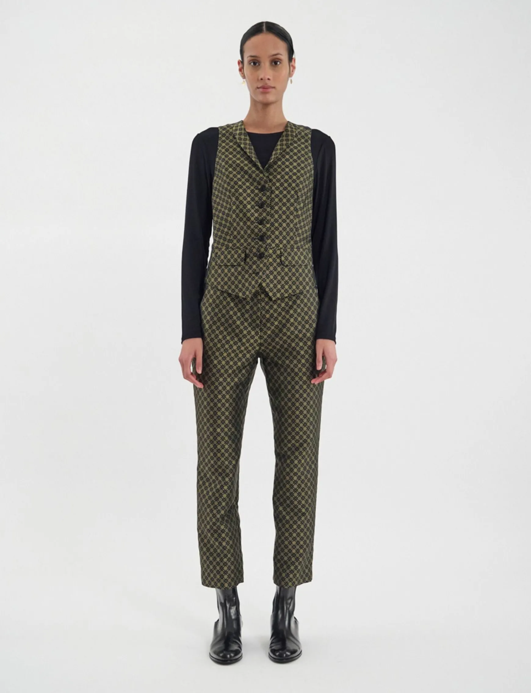 Ines de la Fressange Paris brings you the elegant Robinson waistcoat, a distinguished piece that is back in fashion. This season, the Robinson waistcoat is available in a beautiful black and gold fabric that is extremely refined. It can be worn with a shirt or next to the skin.