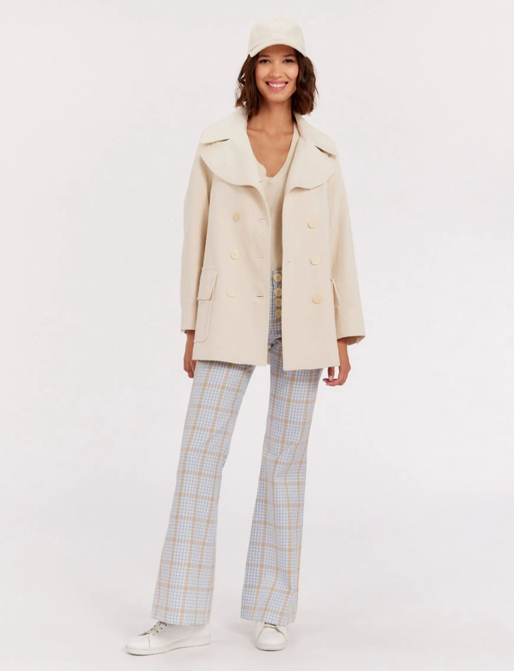 The Séraphine coat is THE classic pea coat that every Parisian must have. Easy to wear, it remains chic and can be worn with everything, you’ll love its timeless elegance and practicality for every day. It’s available for the first time in this very refined ivory fabric, partly made from linen and suitable for fine weather.