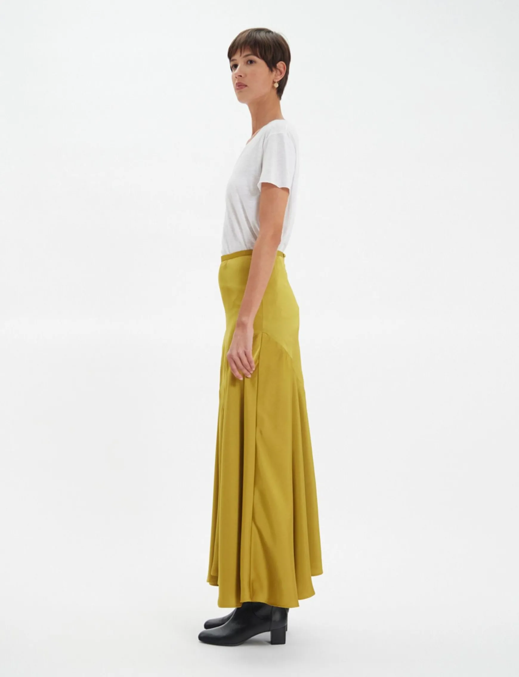 The Velvette Long Skirt is a sophisticated and elegant new style, with its flared cut, flowing fabric, front darts and cut-outs. It gives instant allure and grace to the wearer.